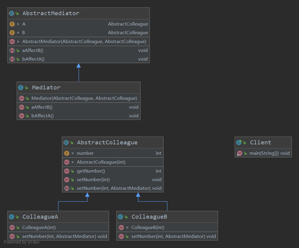 同事类(AbstractColleague和它的子类):如果一个对象会影响其他的对象,同时也会被其他对象影响,那么这两个对象称为同事类。在类图中,同事类只实现了两个,但是在实际应用中,同事类一般由多个组成,他们之间相互影响,相互依赖。同事类越多,关系越复杂。并且,同事类也可以表现为继承了同一个抽象类的一组实现组成。在中介者模式中,同事类之间必须通过中介者才能进行消息传递。