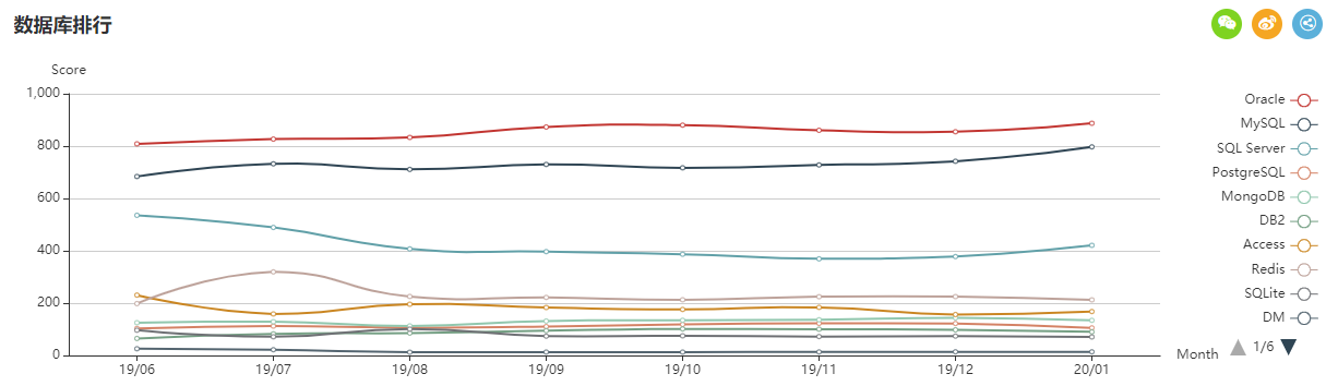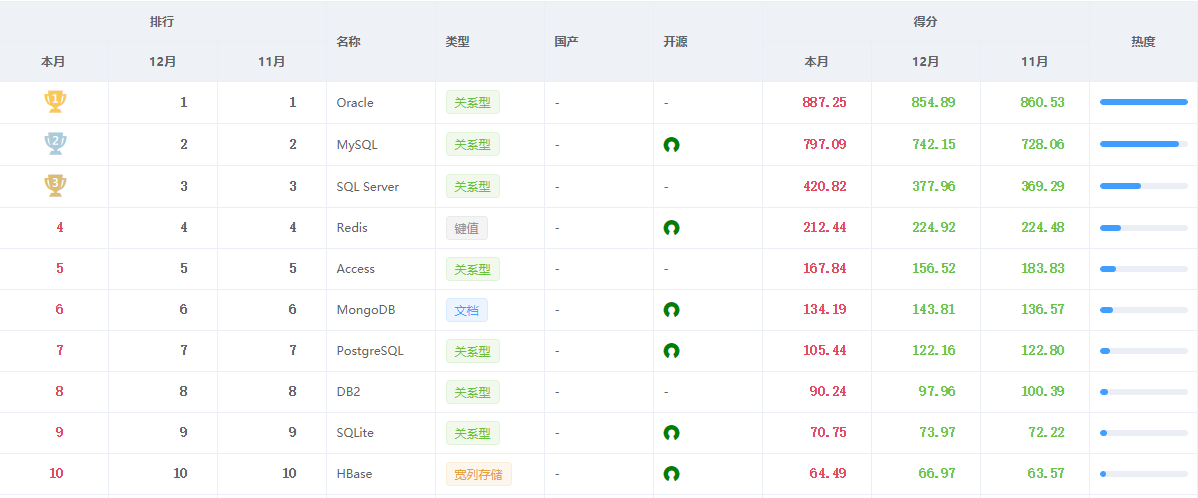 根据墨天轮数据库流行趋势汇总得出年度排行,前三甲依旧是Oracle、Mysql和Sql Server,
