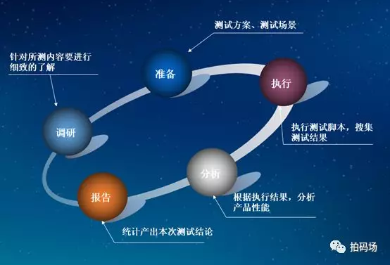 性能测试流程按照不同的测试阶段可分为::调研→准备→执行→分析→报告