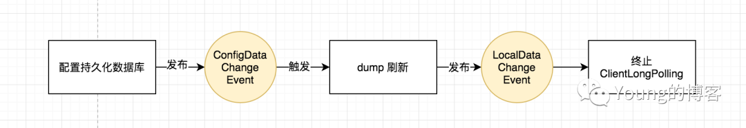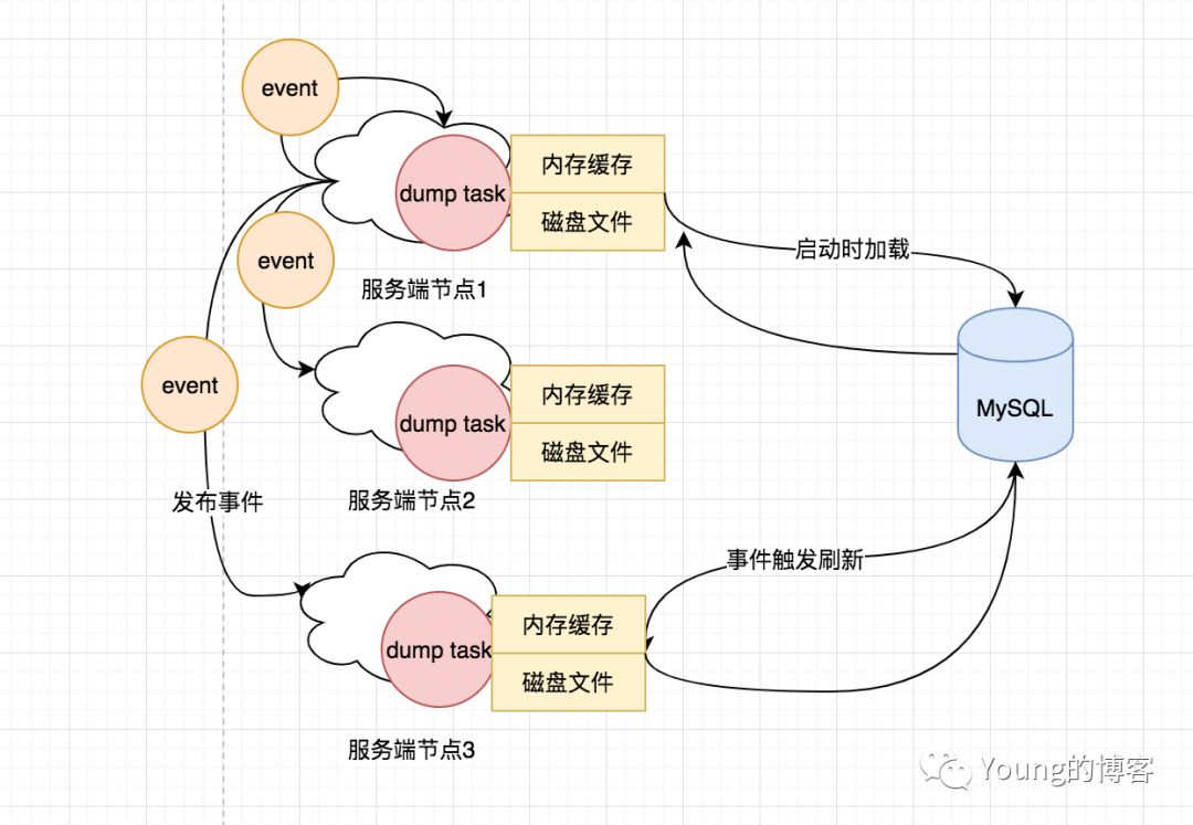 因为服务端并不是针对每次配置查询都去访问 MySQL 的,而是会依赖 dump 功能在本地文件中将配置缓存起来。因此当单台机器保存完毕配置之后,需要通知其他机器刷新内存和本地磁盘中的文件内容,因此它会发布一个名为 ConfigDataChangeEvent 的事件,这个事件会通过 HTTP 调用通知所有集群节点(包括自身),触发本地文件和内存的刷新。