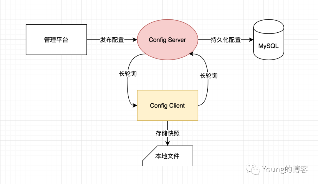 下方的架构图,简要描述了一个配置中心的大致架构,用户可以通过管理平台发布配置,通过 HTTP 调用将配置注册到服务端,服务端将之保存在 MySQL 等持久化存储引擎中;用户通过客户端 SDK 访问服务端的配置,同时建立 HTTP 的长轮询监听配置项变更,同时为了减轻服务端压力和保证容灾特性,配置项拉取到客户端之后会保存一份快照在本地文件中,SDK