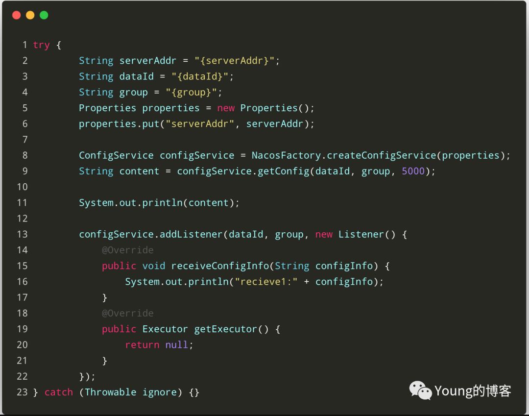 先看一下官方文档中对于 Nacos 的 API 使用的示例代码,第一步是传递配置,新建 ConfigService 实例,第二步可以通过相应的接口获取配置和注册配置监听器。使用方式非常简单易懂,不再赘述。