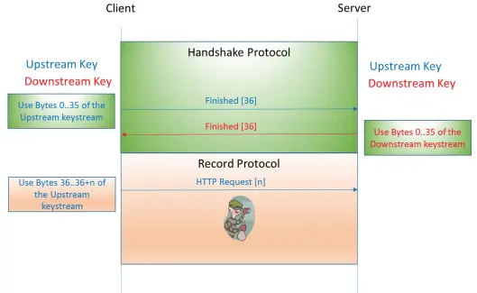 RC4的初始化语句不能正确地配合状态和关键信息,并且保存K个最低有效位存储内部状态; RC4初始状态具有固定的非混合q LSB; 第一个明文字节流的30-50字节的q个最低有效位遵守显著概率确定模式; 第一个明文字节流的30-50字节的q个最低有效位有显著概率暴露。 SSL在很多加密套件中使用RC4进行加密。在握手环节产生RC4密钥用来加密上行数据流和下行数据流。上行数据流中用来加密客户端– 服务器的数据流,下行数据流中用来加密服务器 – 客户端的数据流。加密是有状态的,使用第一个密钥流加密第一个字节的信息,之后的密钥流加密下一条消息(想CBC模式一样)。由于串加密毁灭了最低有效位的确定性,所以不变性弱密钥只能利用于被保护的第一个100字节。