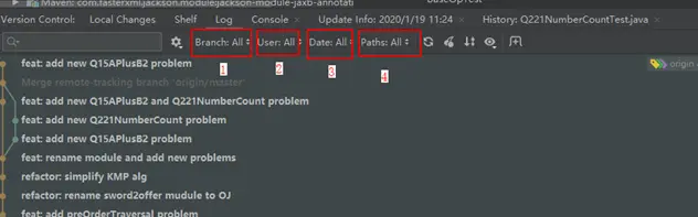 IDEA -> Version Control -> Log,可以指定所要查看的分支,提交人,时间,文件或文件夹。