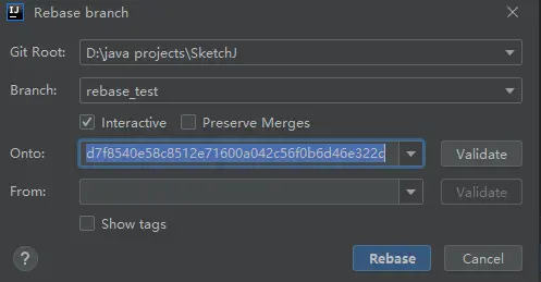 菜单VCS->Git->Rebase,勾上Interactive,Onto粘贴第2步中复制的commit