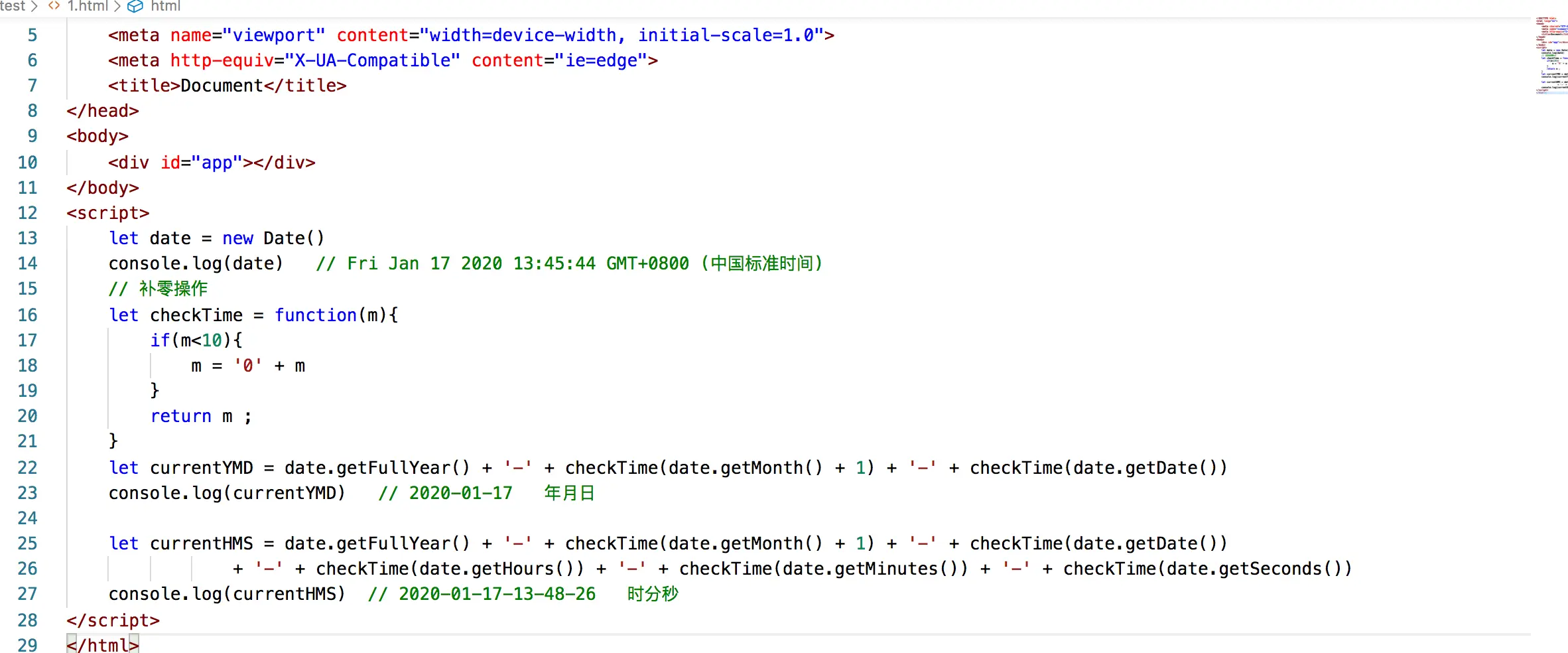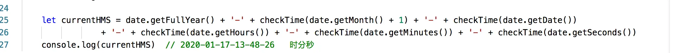 let currentHMS = date.getFullYear() + '-' + checkTime(date.getMonth() + 1) + '-' + checkTime(date.getDate()) + '-' + checkTime(date.getHours()) + '-' + checkTime(date.getMinutes()) + '-' + checkTime(date.getSeconds()) console.log(currentHMS) // 2020-01-17-13-48-26 时分秒