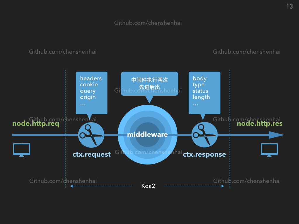 koa主要利用了async和await的特性,执行到下一个中间件的地方暂停执行,执行完后再回复继续执行。