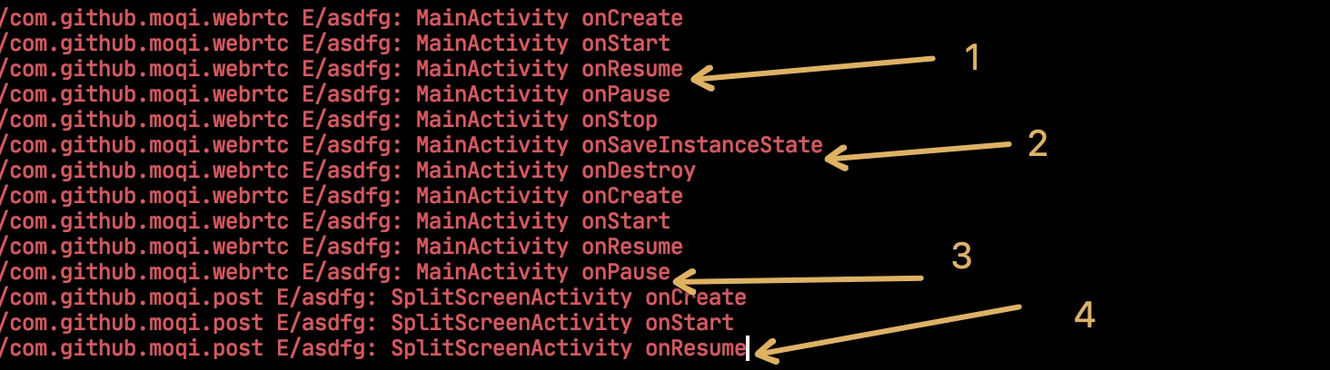 进入和离开分屏模式时,Activity 会触发重建流程,保证在当前窗口尺寸中正确显示,简要的生命周期输出如下: