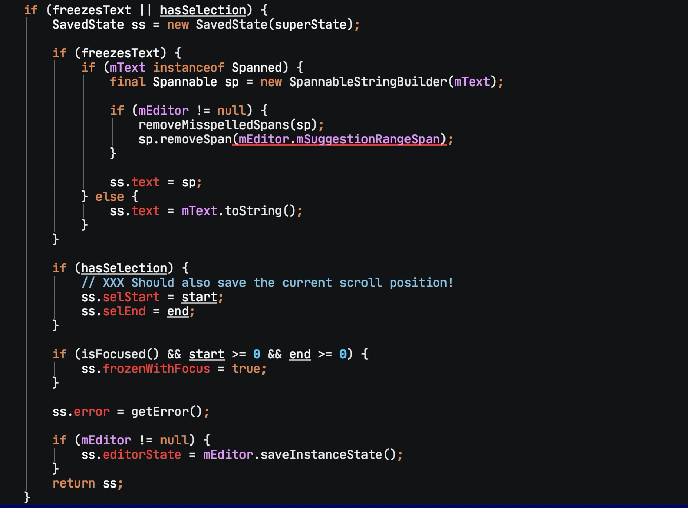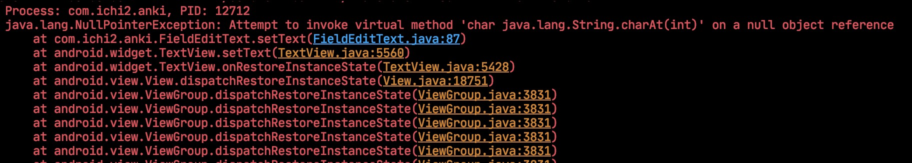 居然不在 NoteEditor 里…怪不得之前的排查数据都没出现错误。看来问题出在 EditText 内部。那么问题变复杂了,如果只写一个 EditText,整个 Activity 重建时自动恢复的数据不会错误,错误的数据是哪里来的呢?这就需要研究 View 的保存和恢复机制了。