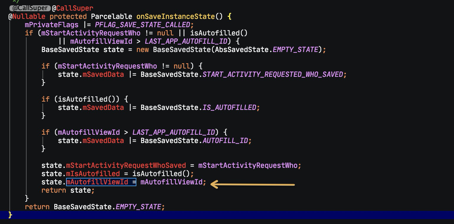 保存的值中出现了 mAutofillViewId。这个 id 是为了统一用户手动设置(比如xml中指定)的 id 和自动生成的 id,是一个 int 变量。