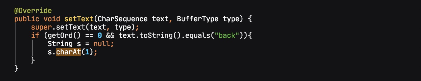 于是把思路转移到 FieldEditText 内部,如果通过调用 setText 的方式修改了文案,那可以重写 setText,通过在其中抛出异常的方式获取方法调用栈,从而快速定位问题。EditText 的 setText 方法有两个,只有一个参数的 setText 是 final 的,但内部还是调用到了两个参数的 setText。重写 setText 并加入异常代码: