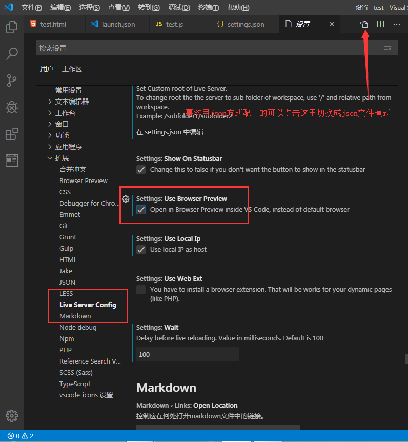 也就是勾选Use Browser Preview,这样当我们打开Live Server的时候就会自动打开Browser Preview来访问我们的页面。
