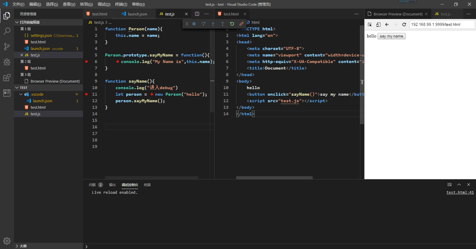 好了,我们已经可以修改页面,并在vscode内实时预览我们的页面效果了。接下来我们再看看如何进行debug。
