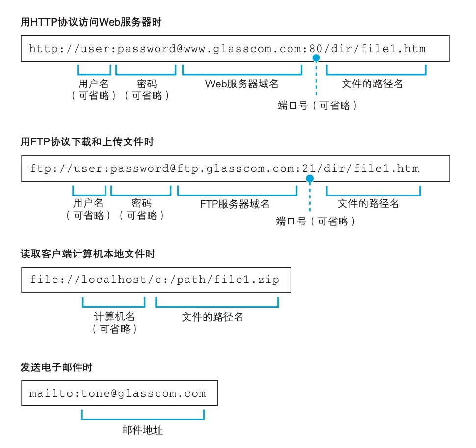 当访问Web服务器时应该使用HTTP协议, 访问FTP服务器时应该使用FTP协议。