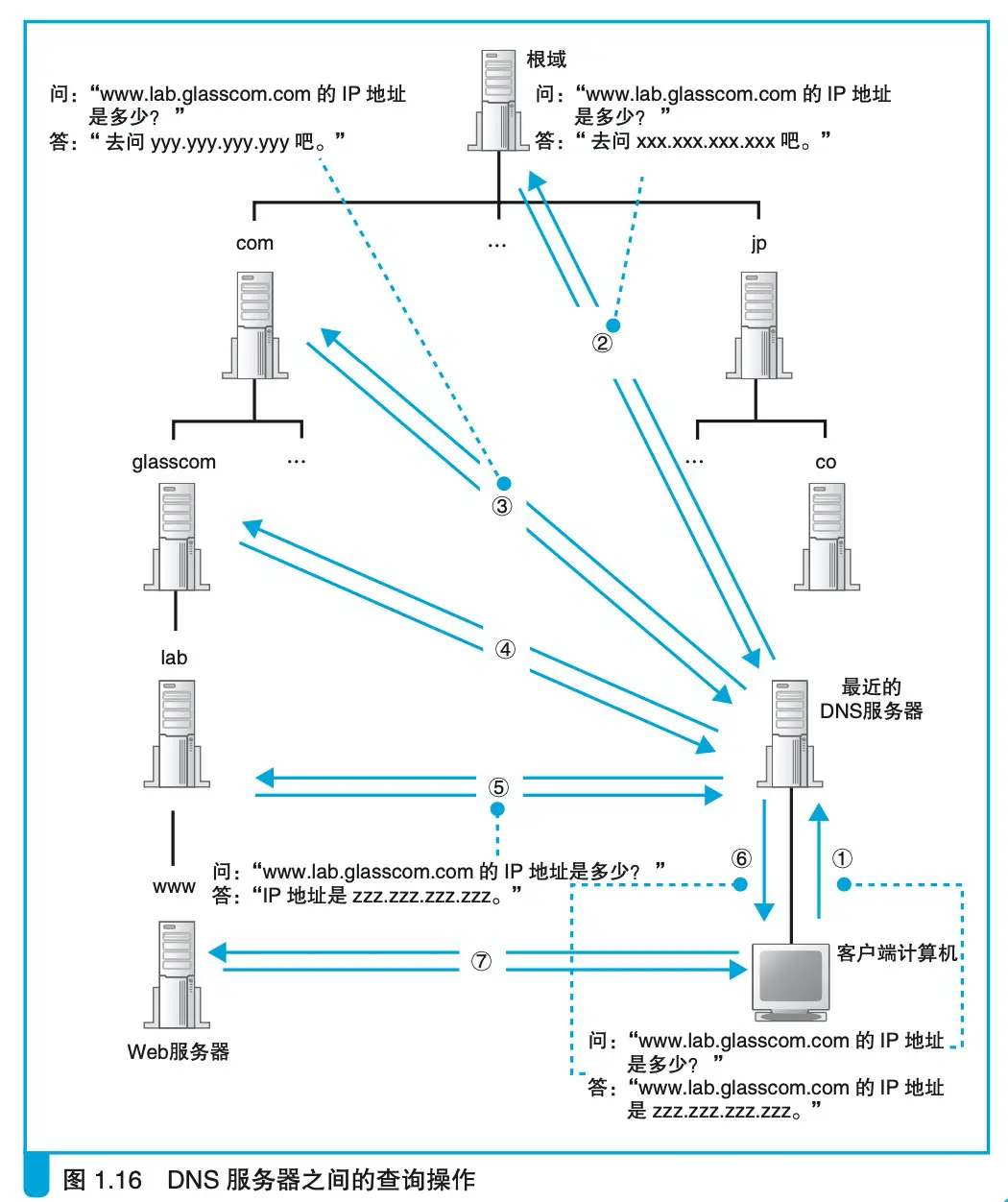 当然, 一个DNS服务器的内存是有限的, 不可能存有所有域名对应的IP地址,当在本服务器上查不到时, 就会展开DNS服务器的大接力, 从而查找要查询的信息。