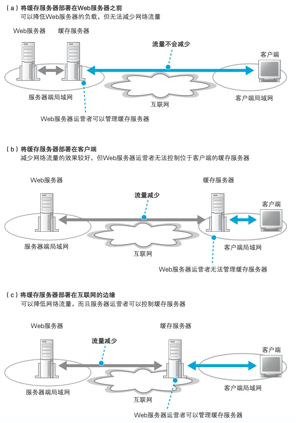 上面的是在 Web 服务器一端部署一个代理,然后利用其缓存功能来 改善服务器的性能,还有一种方法是在客户端一侧部署缓存服务器。