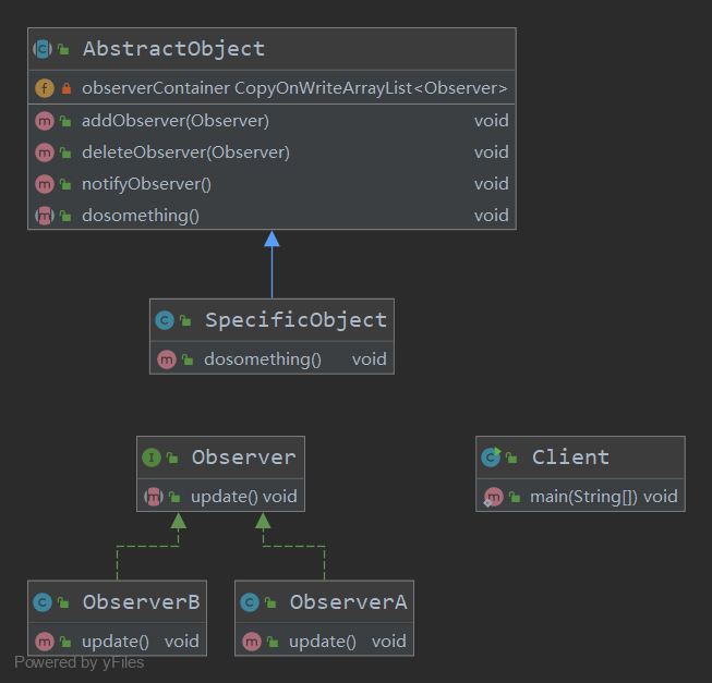 通过运行结果可以看到,我们只调用了specificObject的方法,但同时两个观察者的相关方法都被同时调用了。仔细看一下代码,其实很简单,无非就是在AbstractObject类中关联一下Observer类,并且在doSomething方法中遍历一下Observer的update方法就行了。