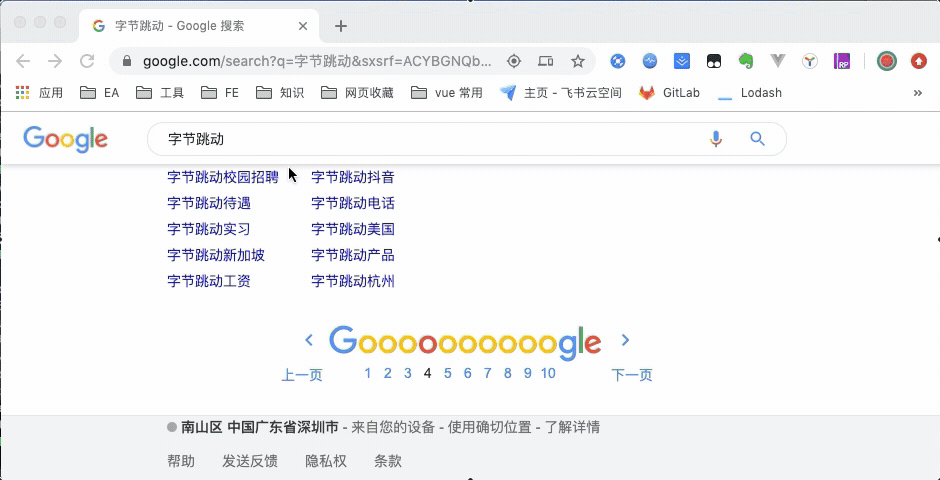 - 3. 新打开的页面正确现实关键字"字节跳动"与第 5 页搜索结果