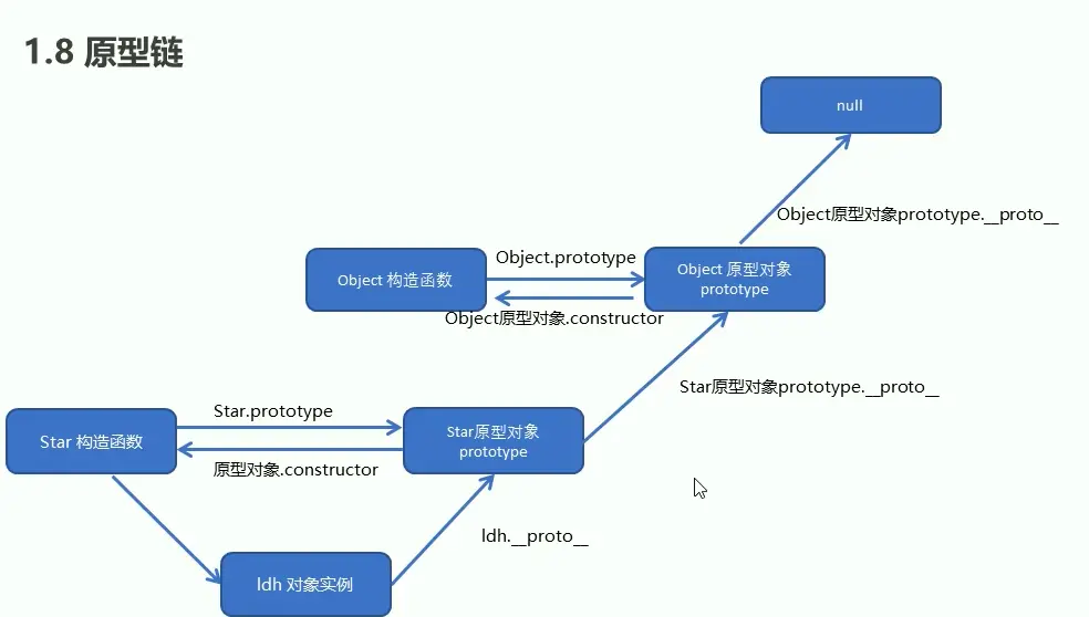- 每个对象都有一个__proto__指向构造函数的prototype原型对象而原型对象本身也是对象,也有__proto__指向的是上一个构造函数的prototype