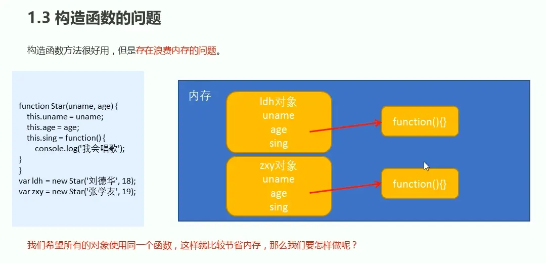 构造函数很好用,但是存在资源浪费的问题 看下面 两个函数中的同一个方法,却要开辟两个空间存储,造成了资源浪费