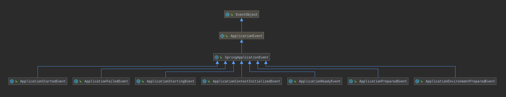 最顶层是 EventObject,它代表的是一个事件对象,接着 ApplicationEvent 继承它,代表这是一个应用事件,之后SpringApplicationEvent代表了这是 Spring 中的系统事件,ApplicationStartedEvent、ApplicationFailedEvent等都是 SpringApplicationEvent 的子类。