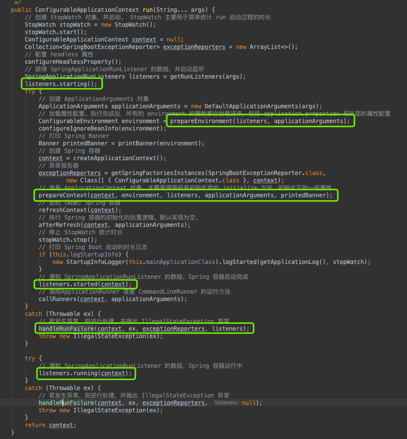 以上关于SpringBoot中监听器的主要核心方法的实现我们已经一点点看过了,看上去很复杂,但是实际上还是按照标准的监听器模式实现的。其中将一系列事件的触发方法封装在一个runListener中,降低了系统的耦合度,使得调用的时候也变得很轻松,这一点很值得我们学习。