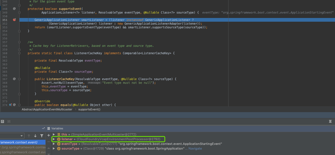 接着会调用 smartListener 的 supportsEventType 方法,判断是否支持该事件。进入方法,首先判断该类是否是 SmartApplicationListener 的子类,通过上面 CloudFoundryVcapEnvironmentPostProcessor 的定义,它不是 SmartApplicationListener 的子类,所以会进入 else 中。