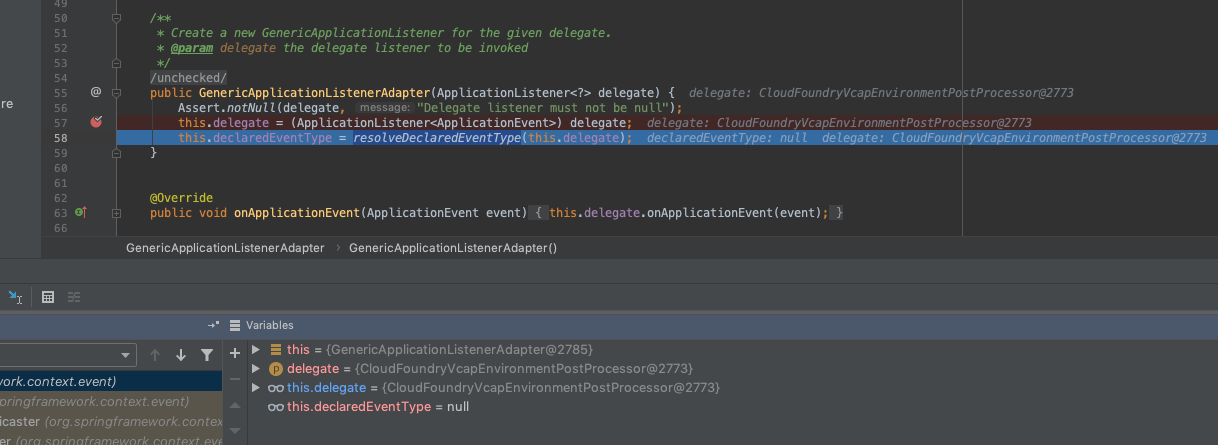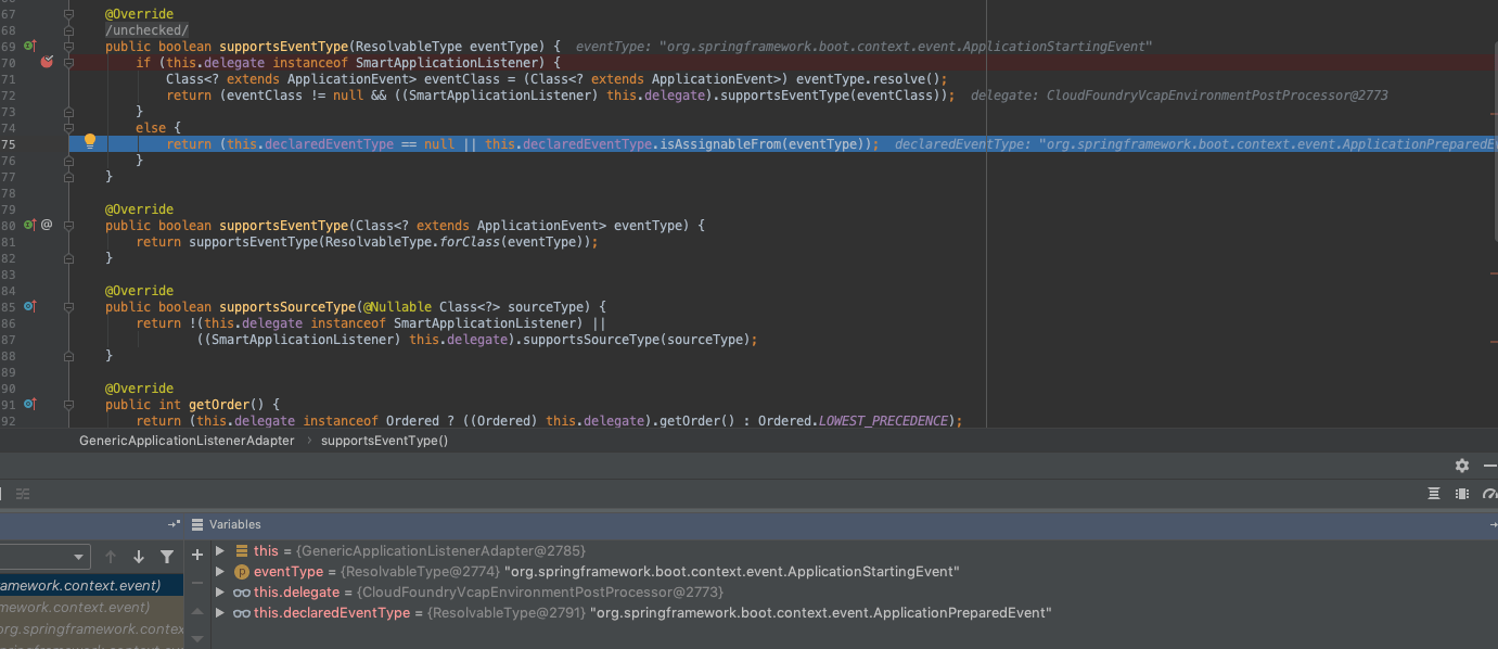首先进入的是 CloudFoundryVcapEnvironmentPostProcessor,该类不是 GenericApplicationListener 的子类,所以会为该类创建一个GenericApplicationListenerAdapter,作为smartListener。断点进入GenericApplicationListenerAdapter中,可以看到,delegate就是CloudFoundryVcapEnvironmentPostProcessor,接着会调用resolveDeclaredEventType方法,来计算当前代理类对哪个事件感兴趣。