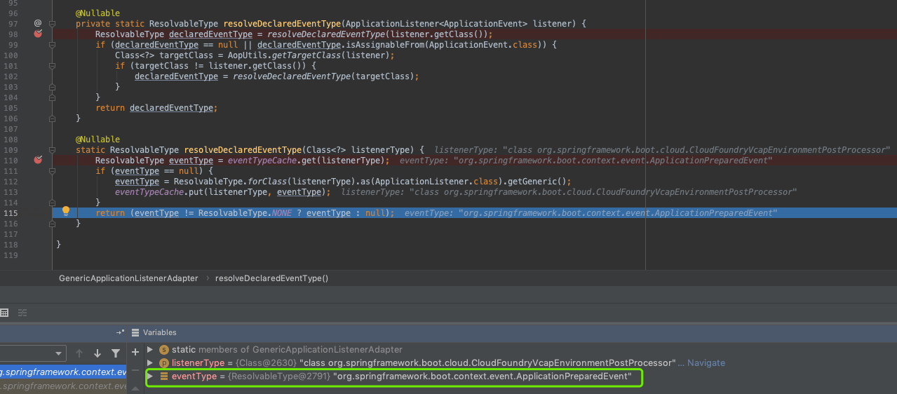 这个resolveDeclaredEventType方法,是spring内部实现的一个泛型解析器,会根据类定义获得该类声明的事件类型,由于CloudFoundryVcapEnvironmentPostProcessor类实现ApplicationListener,泛型是ApplicationPreparedEvent。