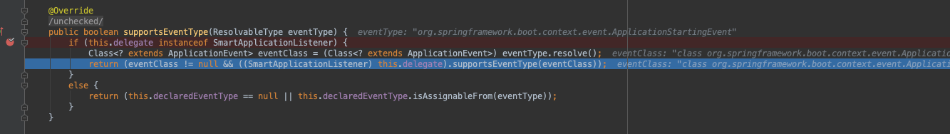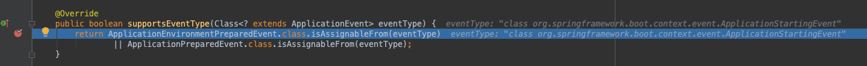 上面得到 declaredEventType 是 ApplicationPreparedEvent ,所以不为null。当前 eventType 是 ApplicationStartingEvent,显然“||”后半部分结果也是false,所以 smartListener.supportsEventType 是false,因为supportsEvent方法后面条件是“&&”,所以后面的内容不必在意,可以直接确定该监听器不支持该事件。