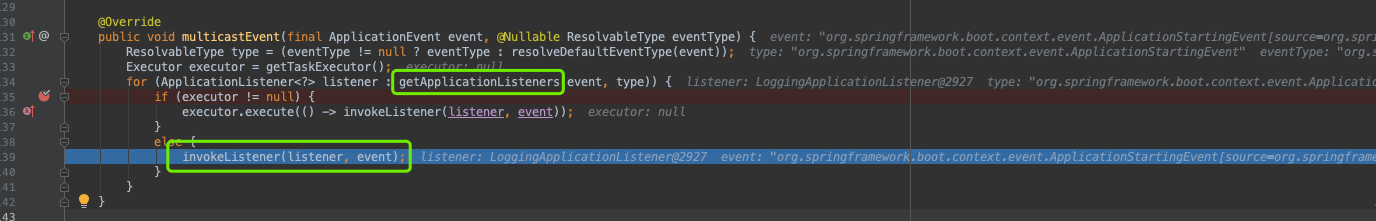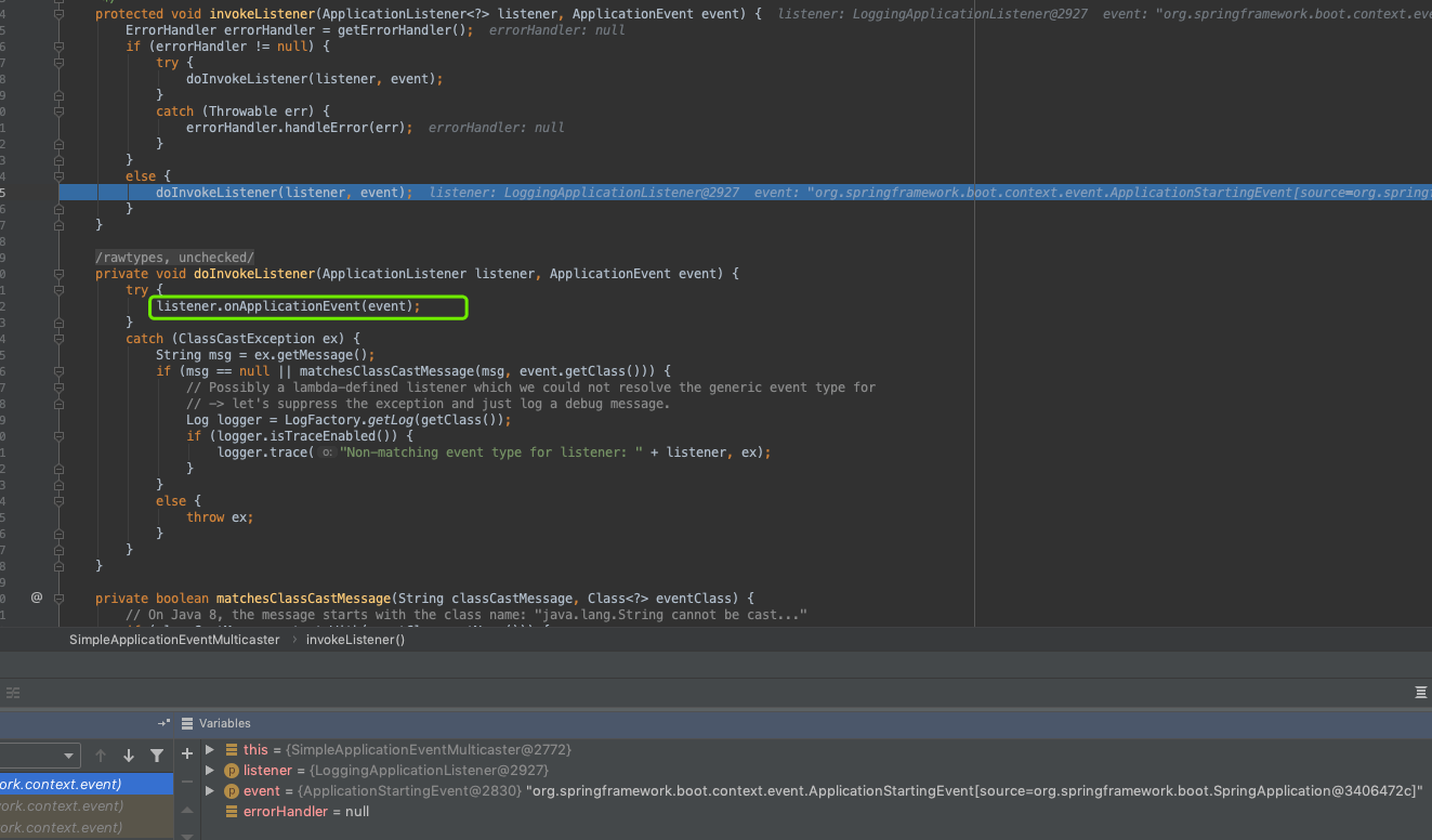 invokeListener方法中会调用doInvokeListener方法,最终我们可以看到listener.onApplicationEvent,这里会进入具体事件的触发