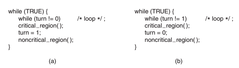 - 严格轮换法:(存在问题:浪费CPU、被临界区之外的进程阻塞)