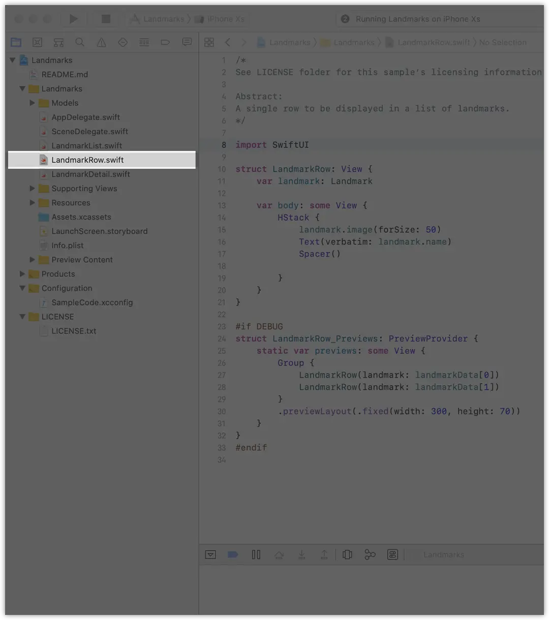 1.1 打开起始项目,在 Project navigator 中选择 LandmarkRow.swift 。