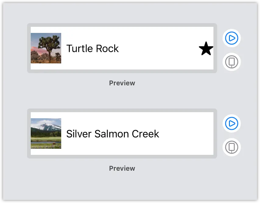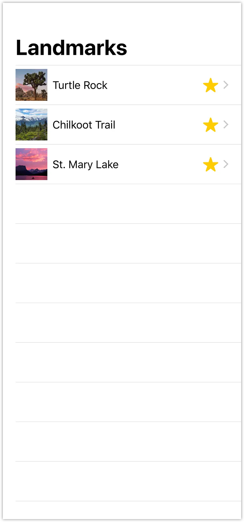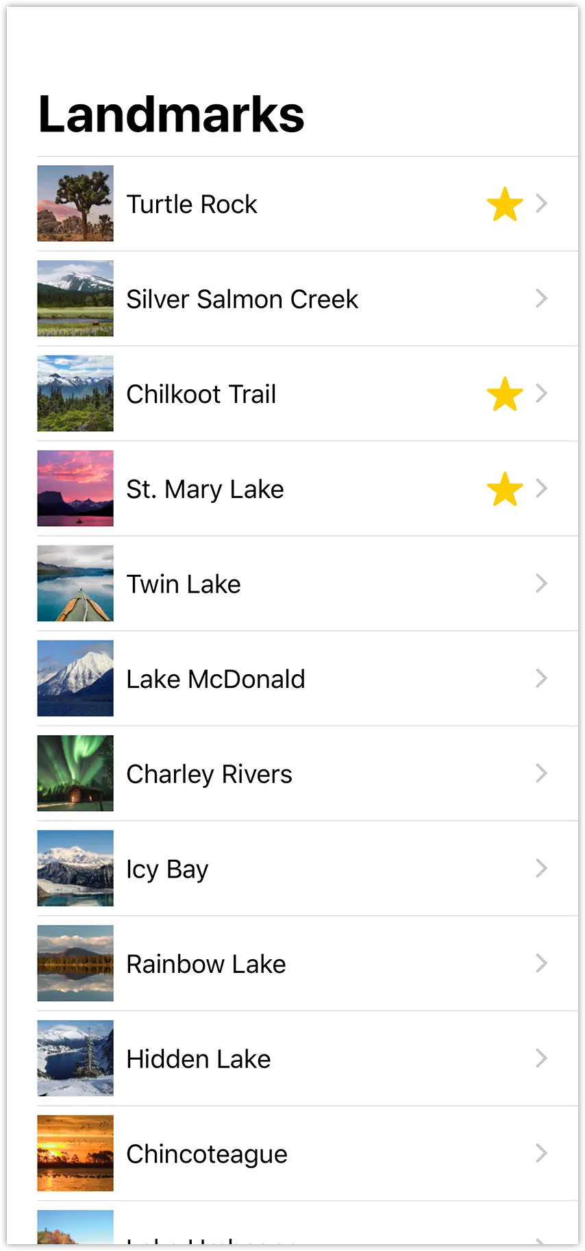 首先,通过优化列表来清晰地给用户显示他们的收藏。给每个被收藏地标的 LandmarkRow 添加一颗星。