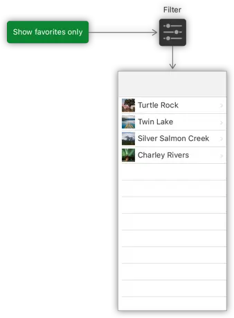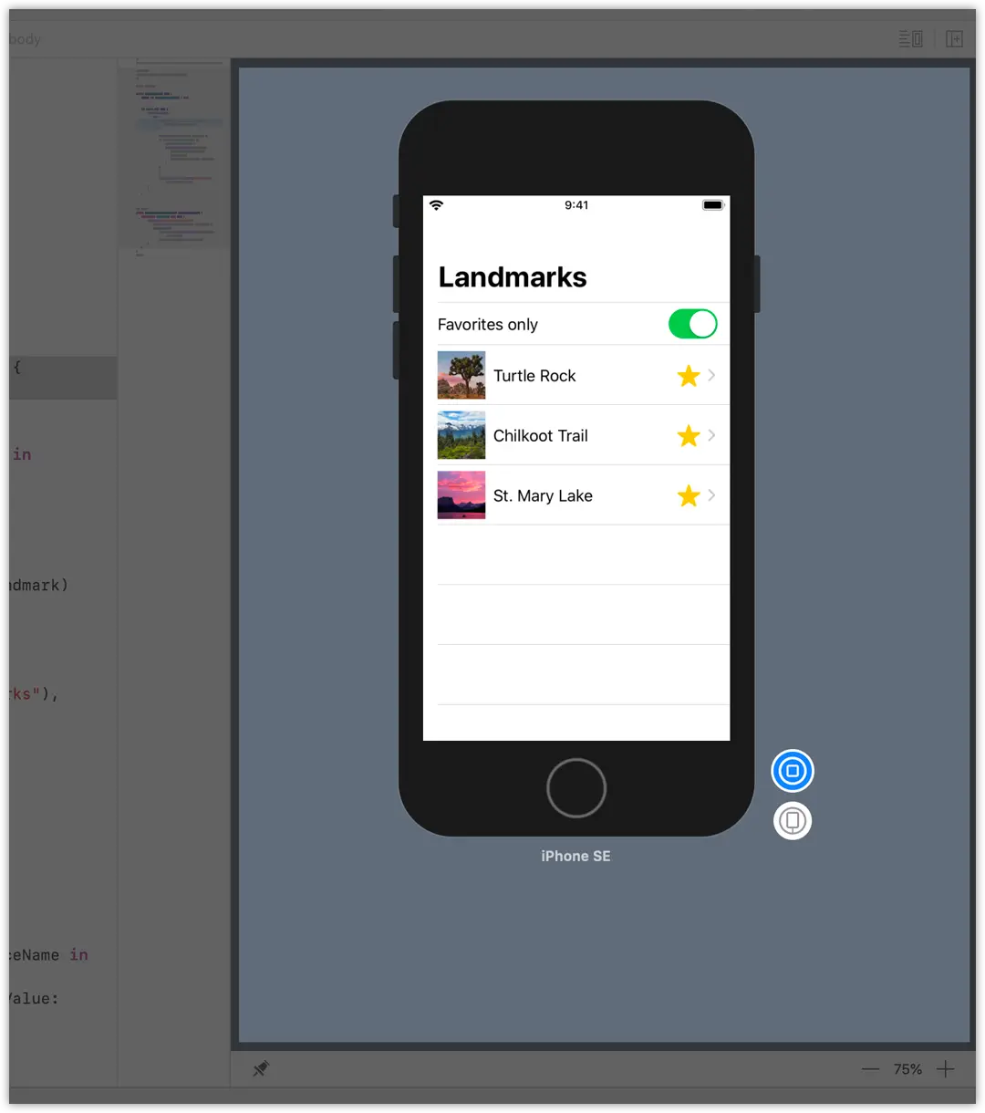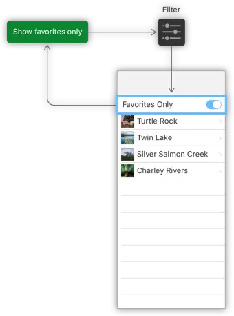 Landmarksapp 中,用户可以标记他们喜欢的地点,并在列表中过滤出来。要实现这个功能,我们要先在列表中添加一个开关,这样用户可以只看到他们收藏的内容。另外还会添加一个星形按钮,用户可以点击该按钮来收藏地标。下载起始项目文件并按照以下步骤操作,也可以打开已完成的项目自行浏览代码。