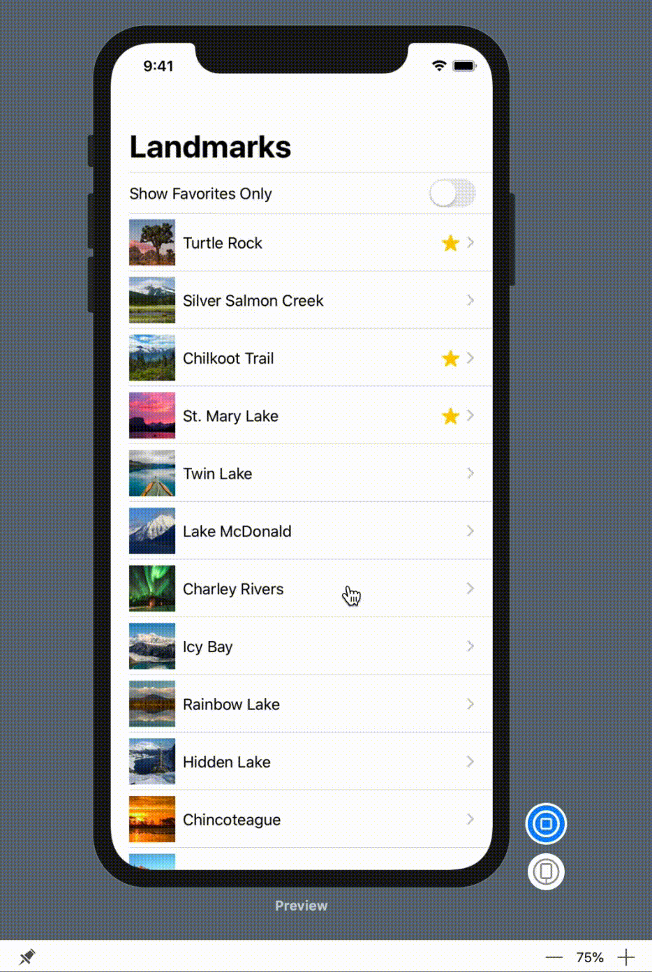 5.6 切回 LandmarkList.swift ,打开实时预览来验证一切是否正常。