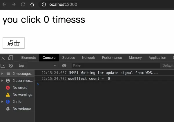 4、点击 计数器 , 打印 “Component2 [] return” 、“Count useEffect current 0” 、“Count []”,这个过程的分析与上面一致,不在赘述。