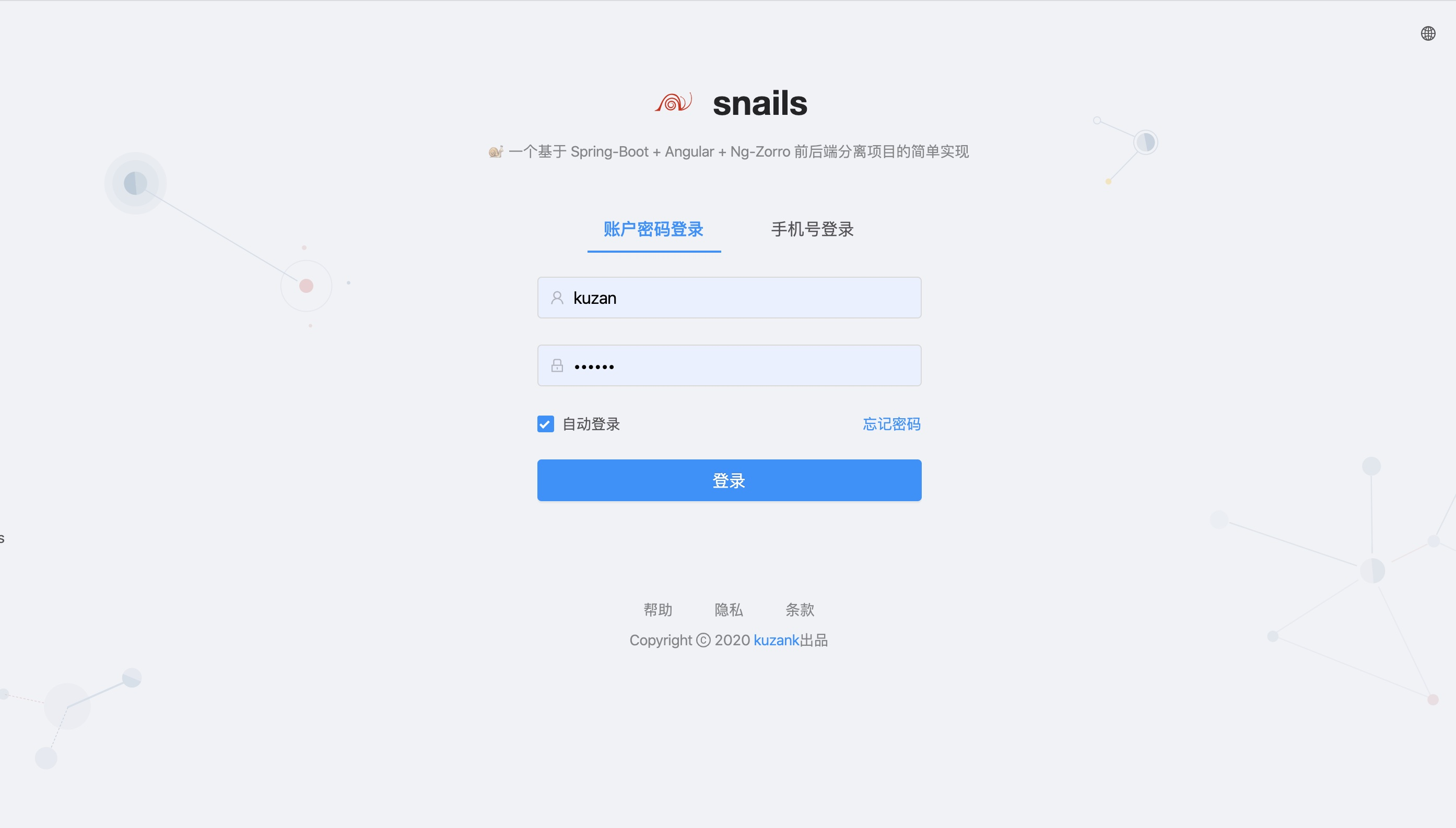 Snails 项目源于给实习生做的一个 Ng-Alain + SpringBoot 入门学习项目,随着项目逐步完善,便将其开源并正式发布 Snails 1.0 版本。