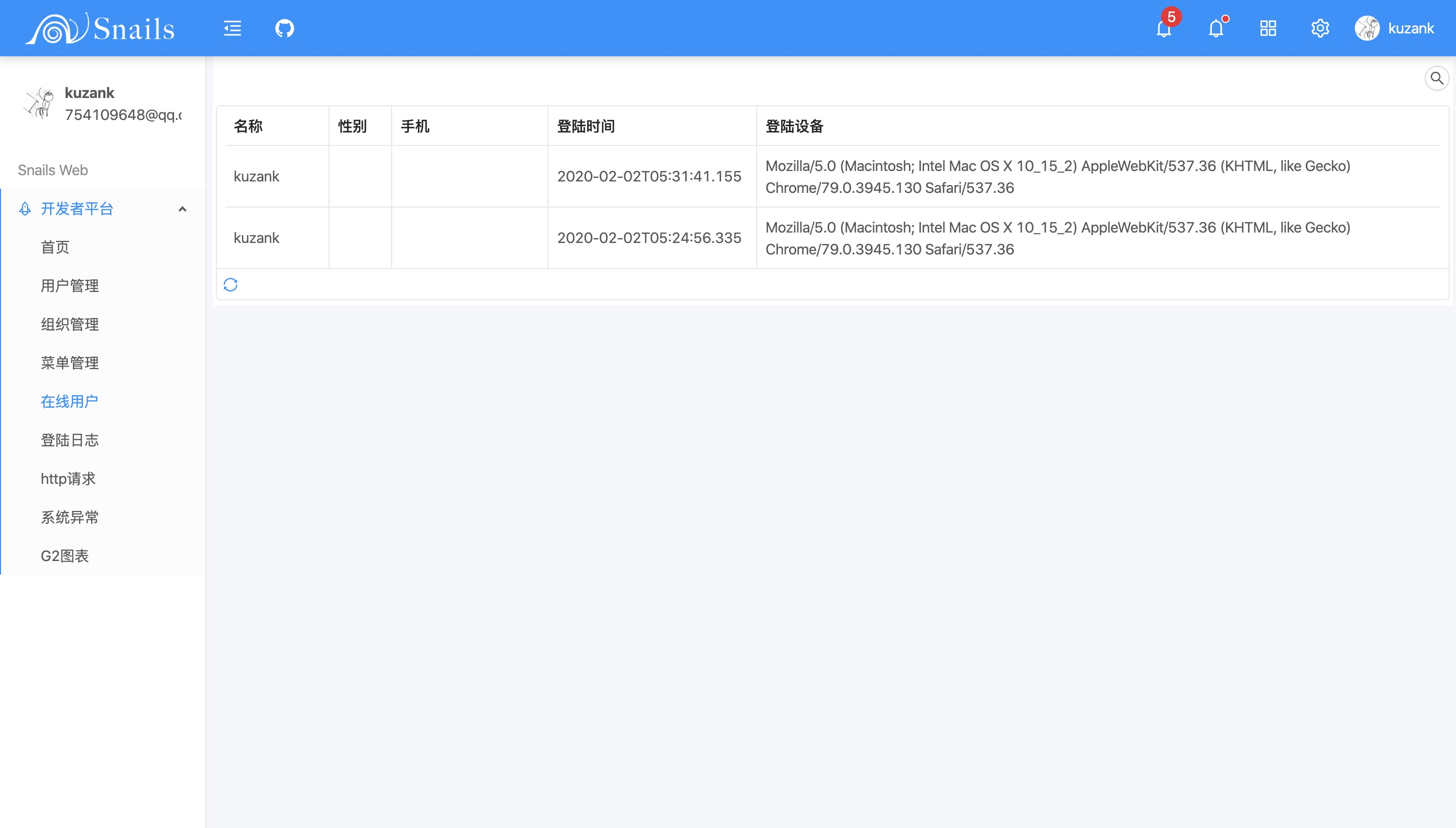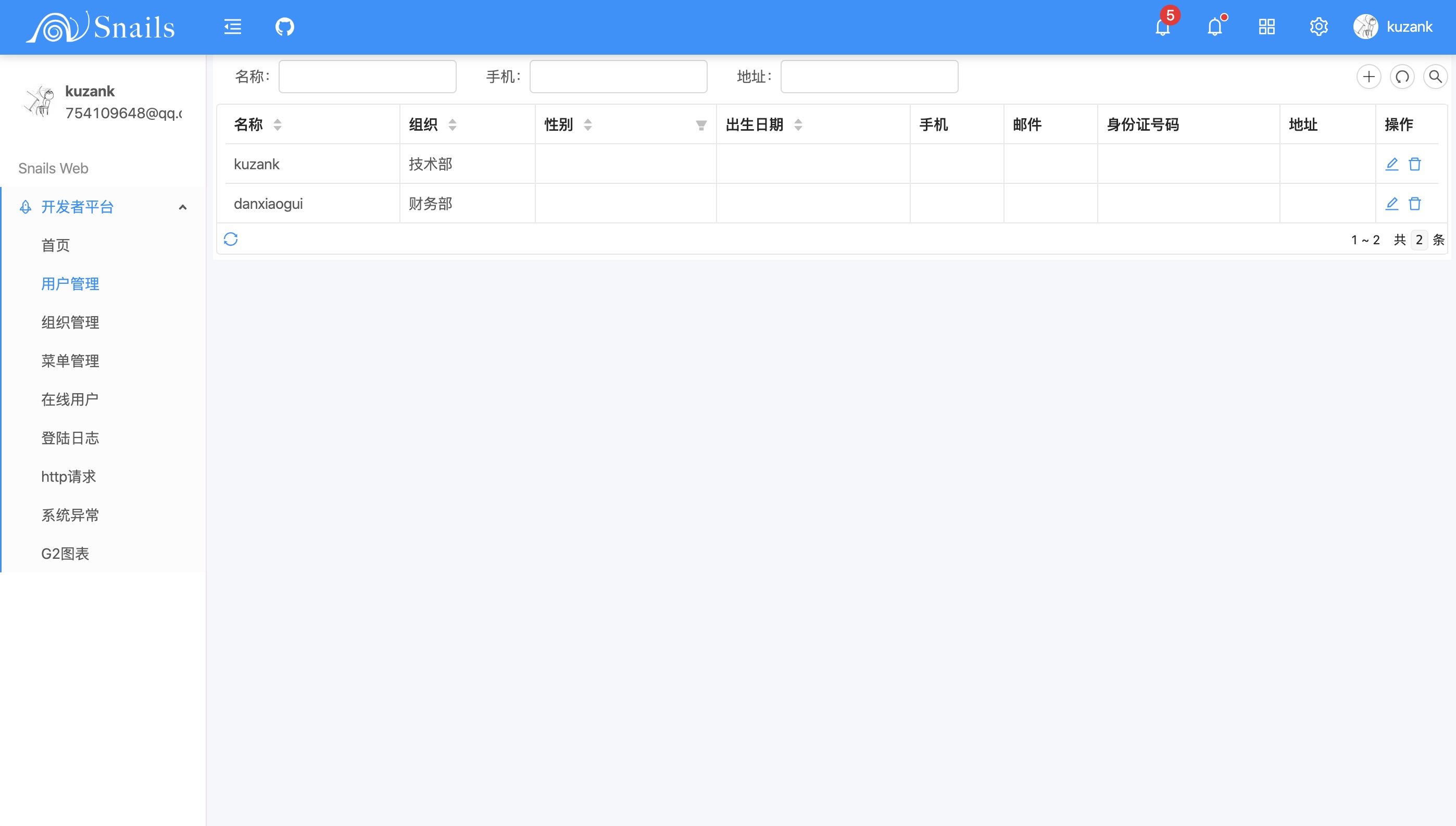 系统默认用户、账号、密码信息,数据在 snails-api 启动后初始化到数据库中,源码在 snails-api/src/main/java/com/kuzank/snails/init/InitPerson.java