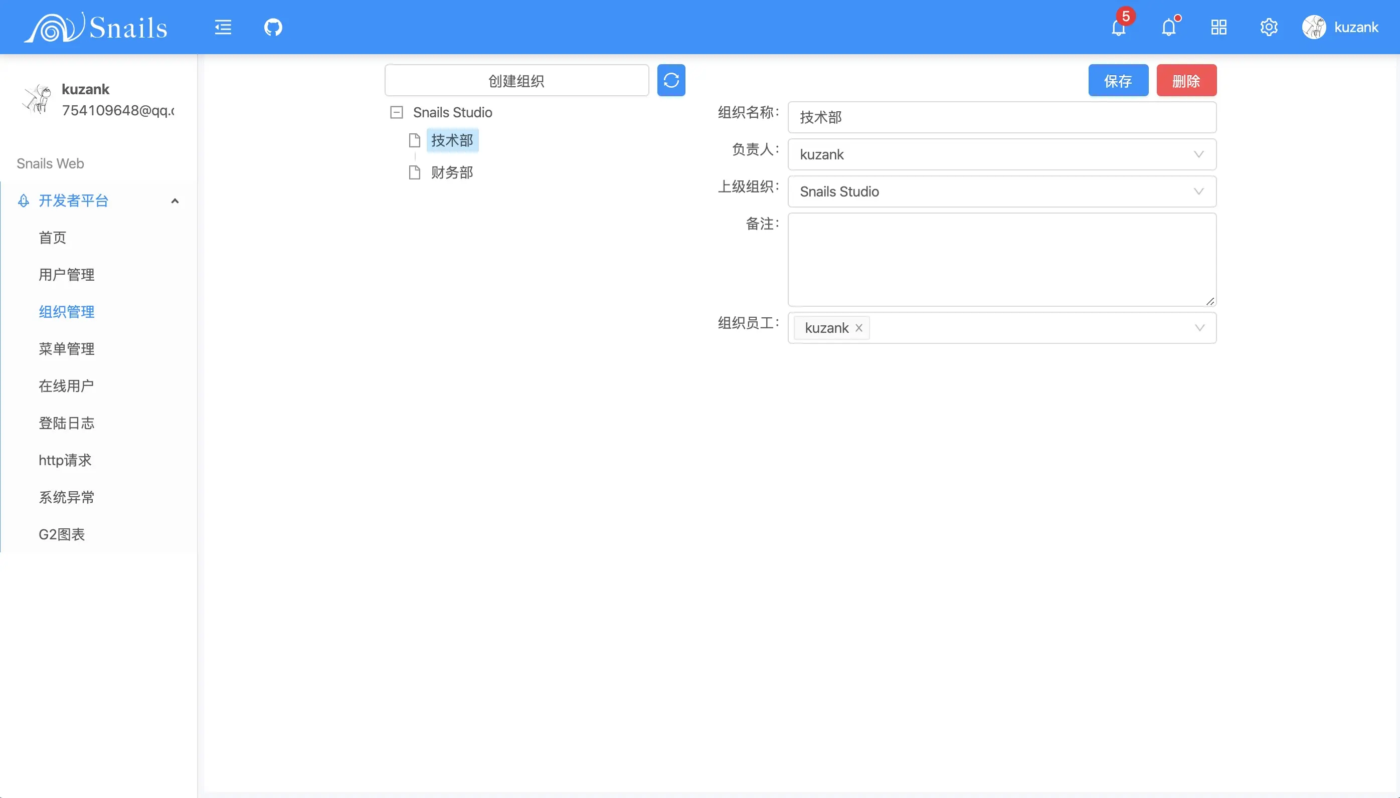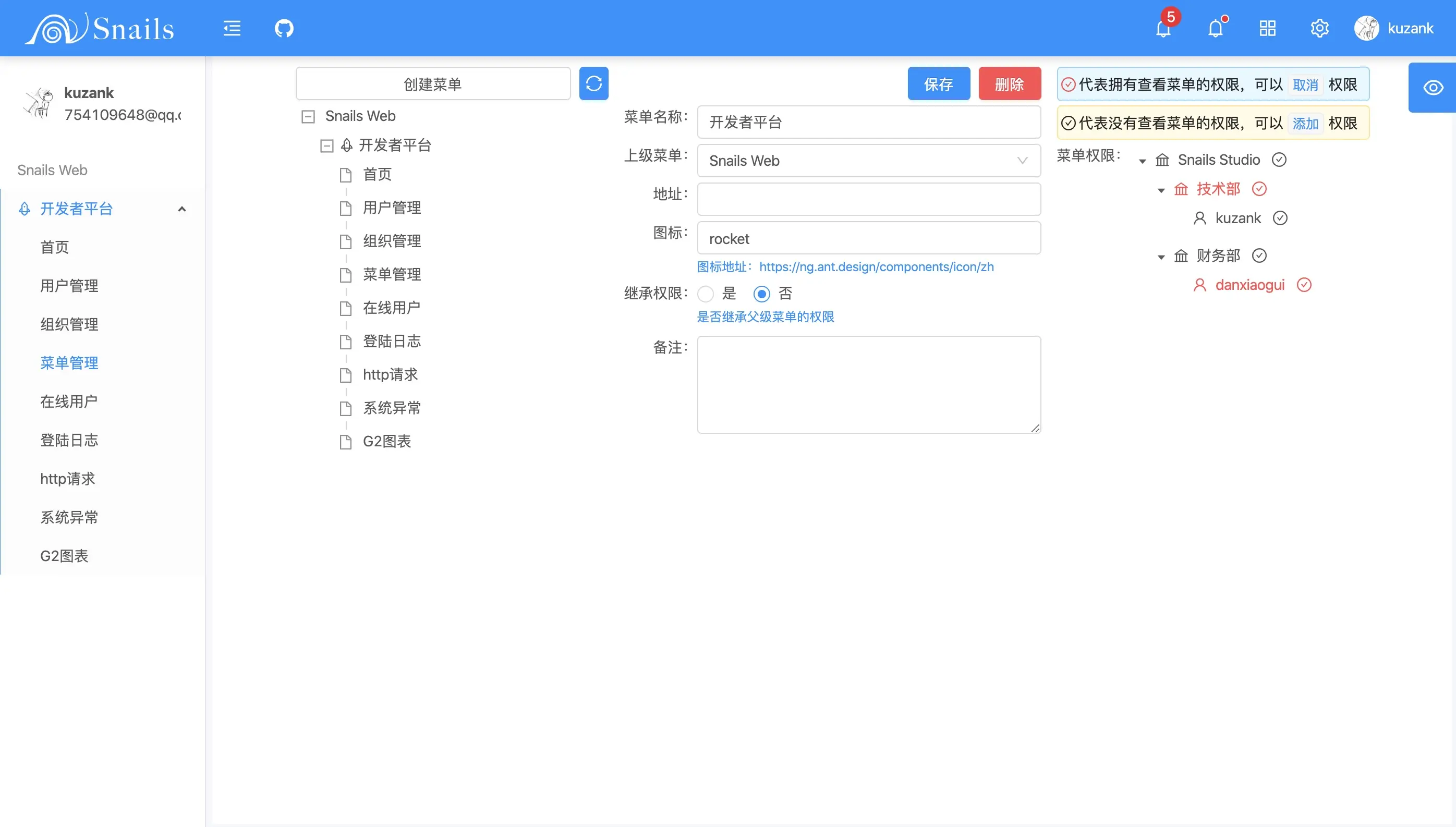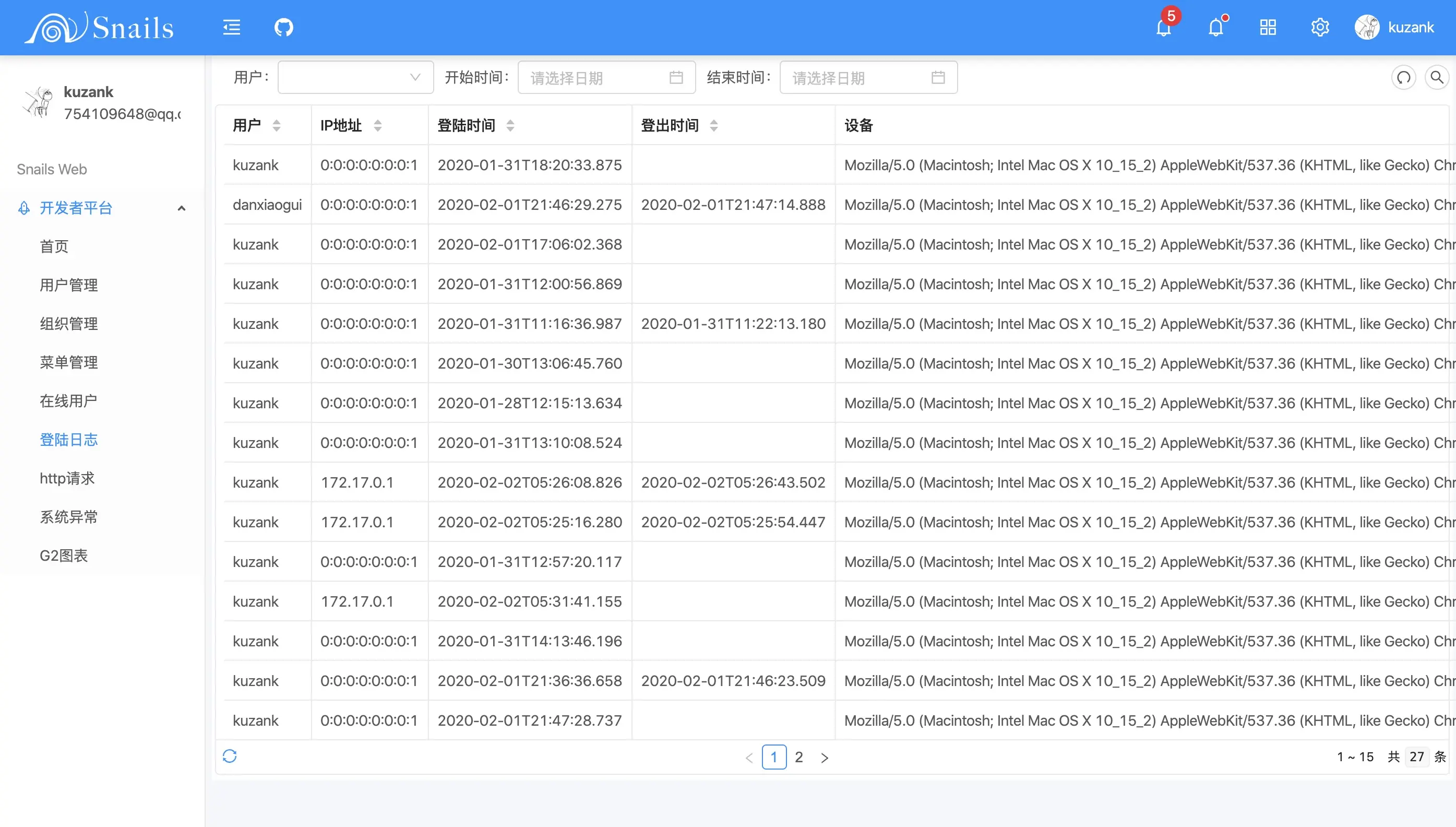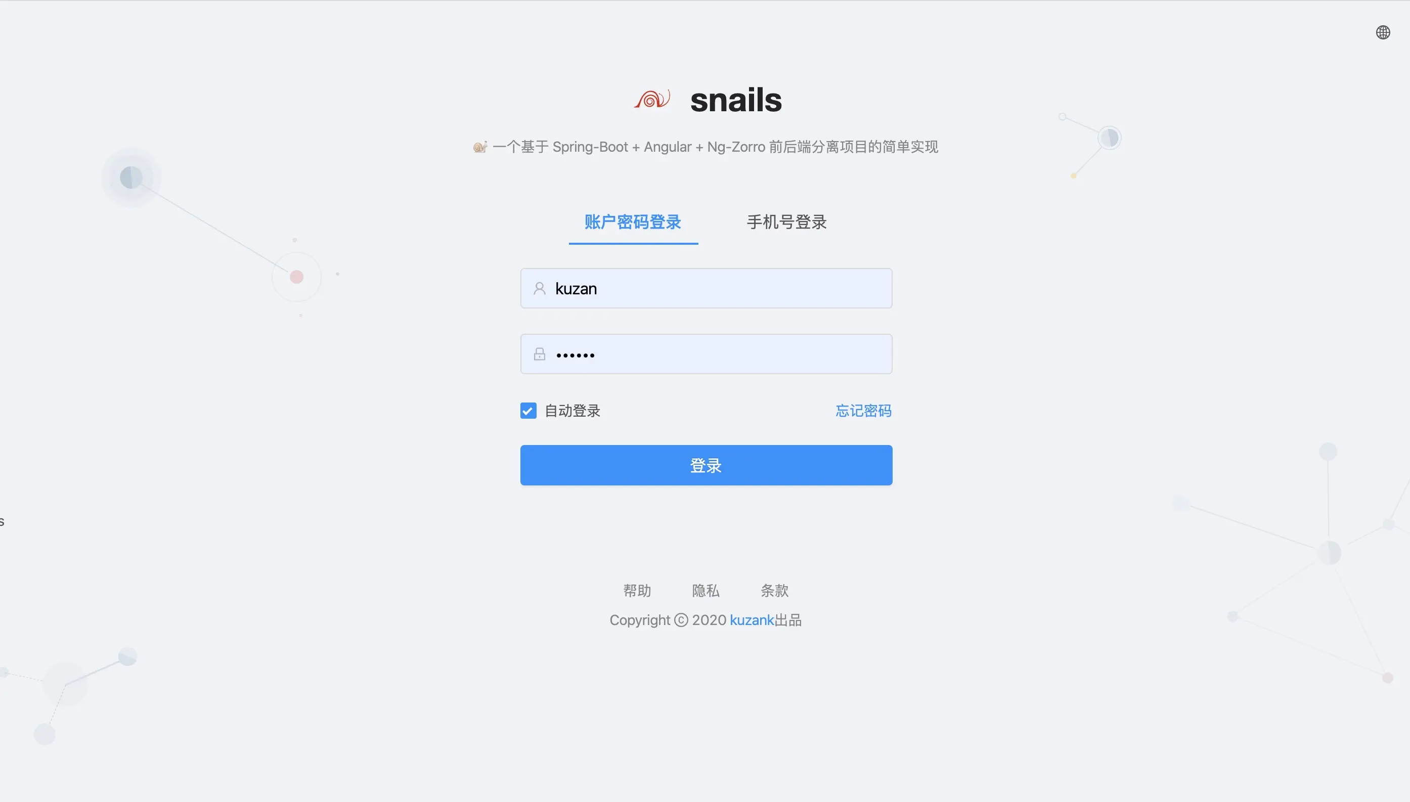 基于 SpringBoot + Ng-Alain 前后端分离的实现,可以作为新手入门项目,也可以作为小项目的基础框架去扩展。目前 Snails 系统框架已支持基本的后台功能,基于简单、实用设计,并且已支持 Docker 进行项目部署。