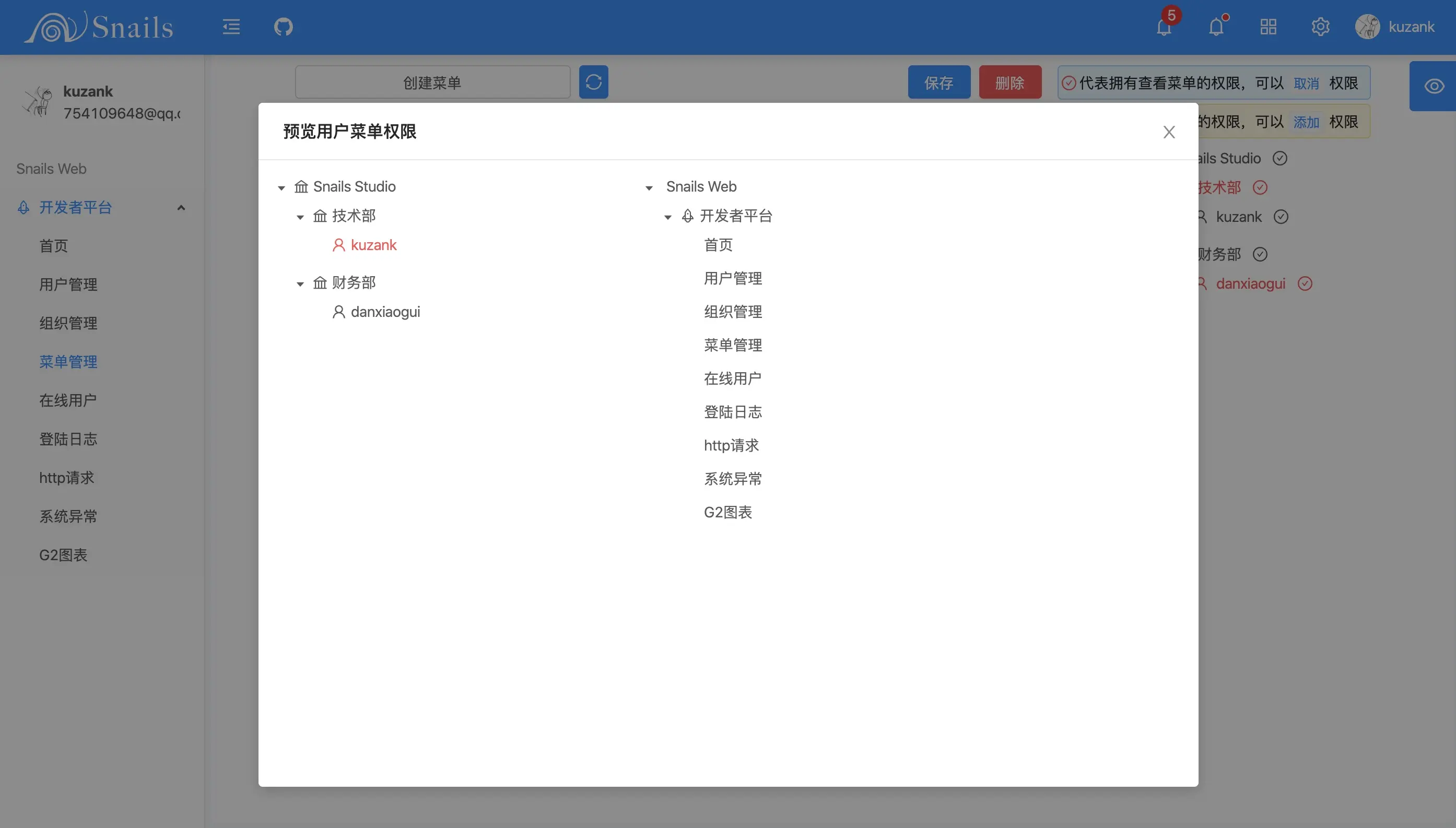 - 菜单管理,支持菜单配置、菜单权限配置、用户菜单权限预览功能