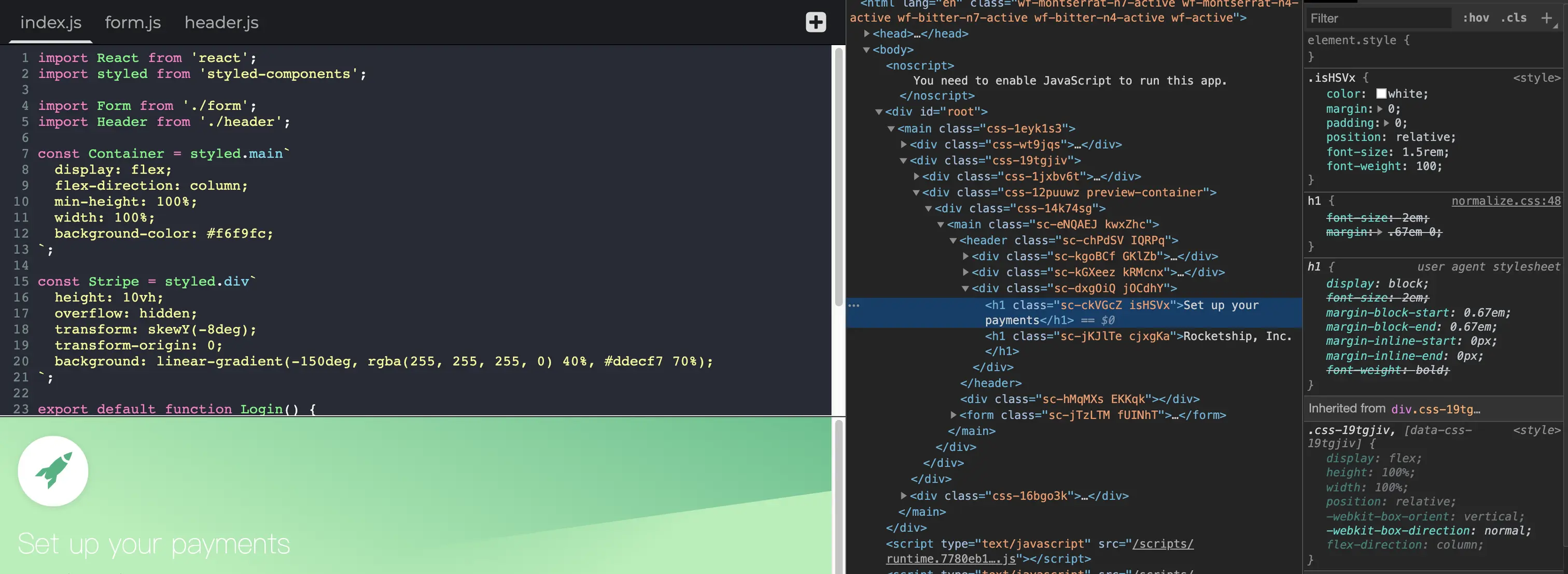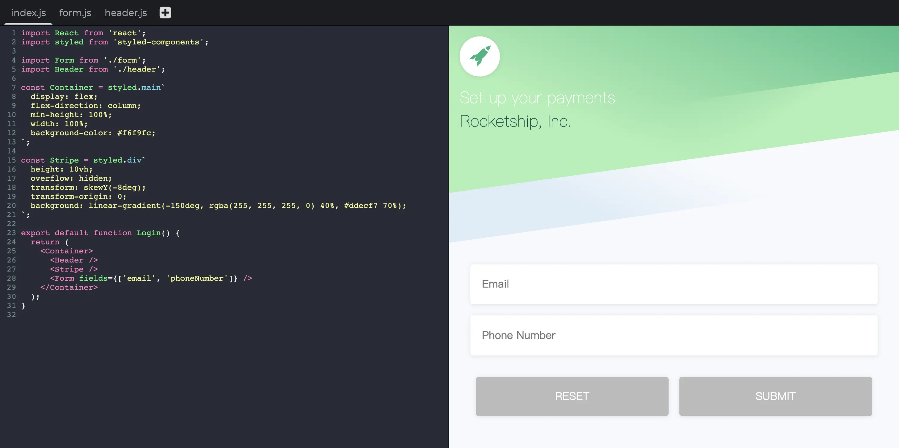 CSS-in-JS Playground是一个可以快速尝试不同CSS-in-JS实现的网站,上面有一个简单的用styled-components实现表单的例子: