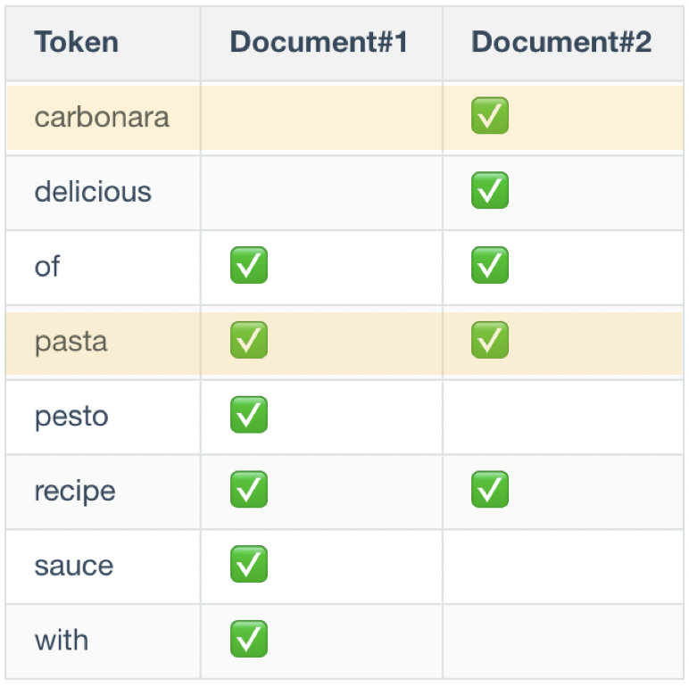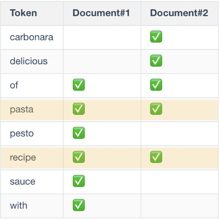 先分词,得到2个 token,( “pasta”、“recipe” )。