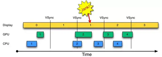 第二个16ms:因为早在上一个16ms时间内,第1帧已经由CPU,GPU处理完毕。故Display可以直接显示第1帧。显示没有问题。但在本16ms期间,CPU和GPU却并未及时去绘制第2帧数据,而是在本周期快结束时,CPU/GPU才去处理第2帧数据