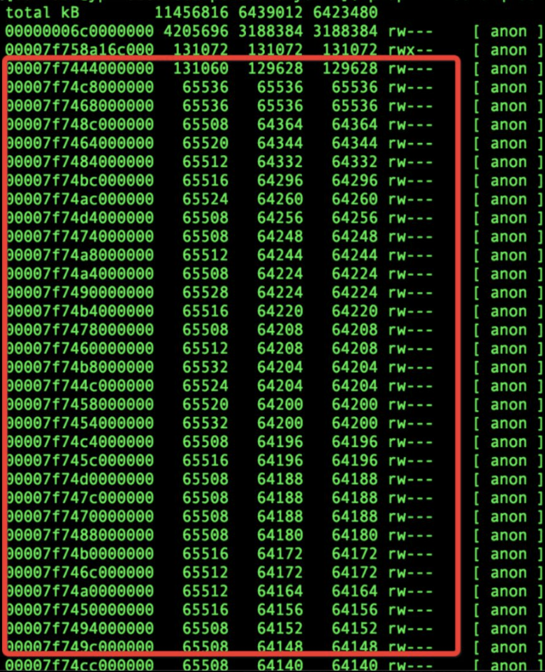 pmap查看内存分布,发现大量的64M的地址(pmap -x pid),没留图,网上找的图片,