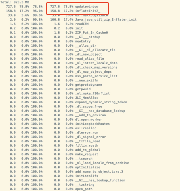 比较了下前后两个内存的占用,这里当前dump的总共923,看到占用最多的是updatewindow,自己就占用了727.