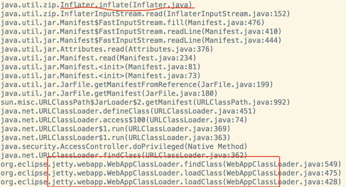 看了下jetty的github,有这么一个issues github.com/eclipse/jet… 大概是jetty为了支持Servlet3.0规范里的注解,比如@WebServlet,会扫描当前项目依赖的jar包,找到标注对应注解的类,来加载为servlet操作、这里用到了jdk的提供的gzip解压缩类,这里jdk并没有对使用到的堆外占用进行释放。