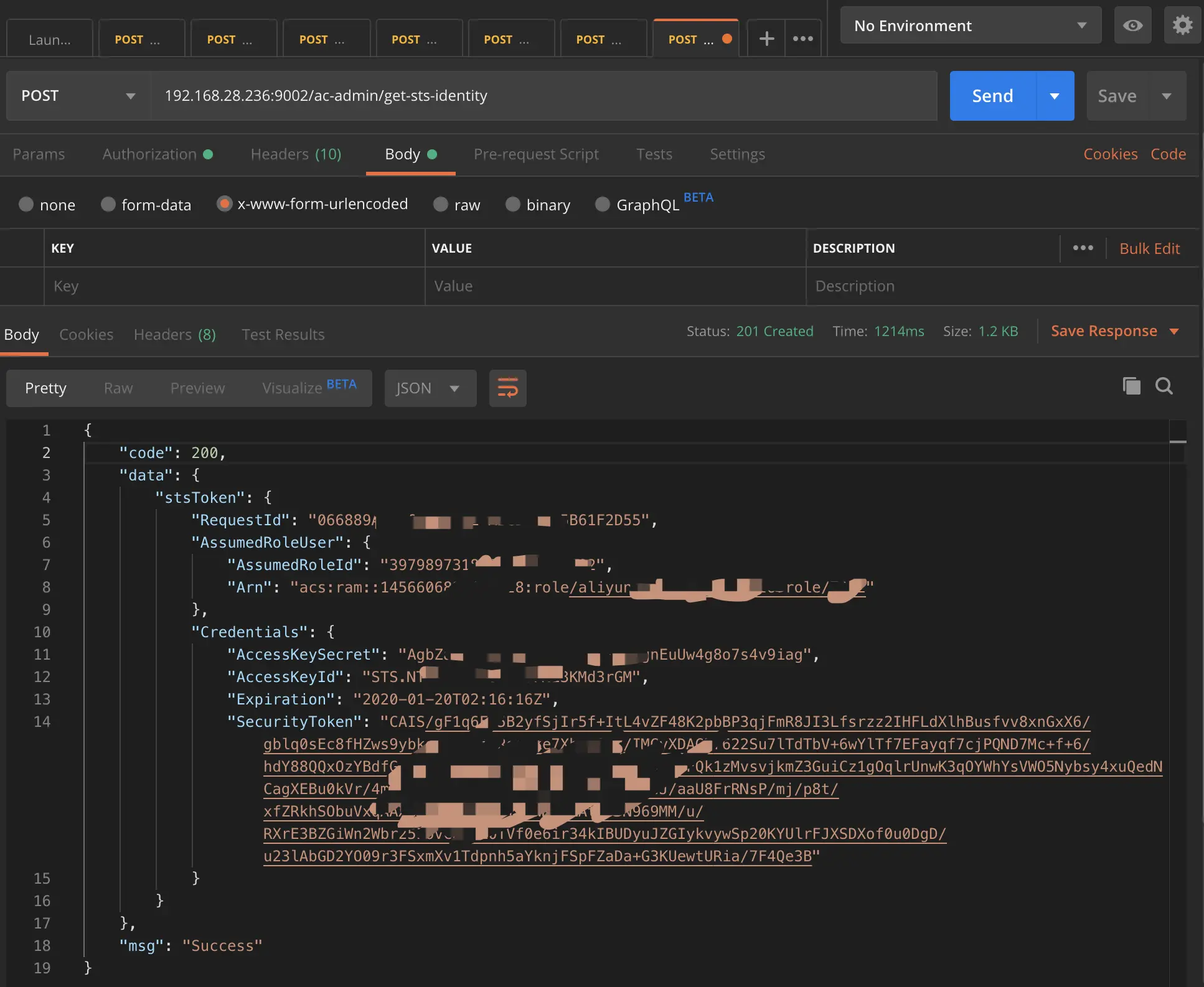 现在,就可以通过/get-sts-identity来请求接口了,Postman 的请求结果如下:
