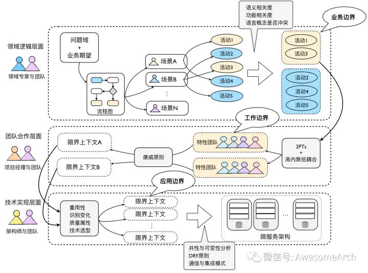 我在一些项目中尝试着结合了诸多需求分析方法与设计原则,慢慢摸索出了属于自己的一套体系。归根结底,限界上下文就是“边界”,这与面向对象设计中的职责分配其实是同一道理。限界上下文的识别并不是一蹴而就的,需要演化和迭代,结合着我对限界上下文的理解,我认为通过从业务边界到工作边界再到应用边界这三个层次抽丝剥茧,分别以不同的视角、不同的角色协作来运用对应的设计原则,会是一个可行的识别限界上下文的过程方法。当然,这个过程相对过重,如果仅以此作为输出限界上下文的方法,未免有些得不偿失。需要说明的是,这个过程除了能够帮助我们更加准确地识别限界上下文之外,还可以帮助我们分析需求、识别风险、确定架构方案。整体过程如下图所示: