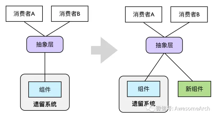 在这个过程中,我们可以借鉴技术栈迁移中常常运用的“抽象分支(Branch By Abstraction)”手法。该手法会站在消费者(Consumer)一方观察遗留系统,找到需要替换的单元(组件);然后对该组件进行抽象,从而将消费者与遗留系统中的实现解耦。最后,提供一个完全新的组件实现,在保留抽象层接口不变的情况下替换掉遗留系统的旧组件,达到技术栈迁移的目的: